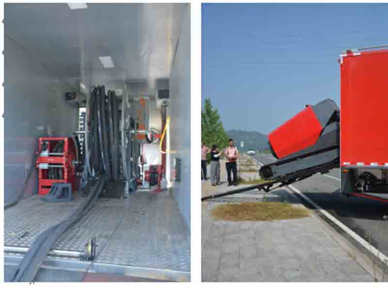 移動排水泵站及液壓系統放置室:車廂中段用于停放液壓裝置、液壓油箱及放置油管絞盤。車廂后門為下開式,行車時作為后門,保護車內設施,當子車下車時,可作為其階梯,使子車平穩上下車。